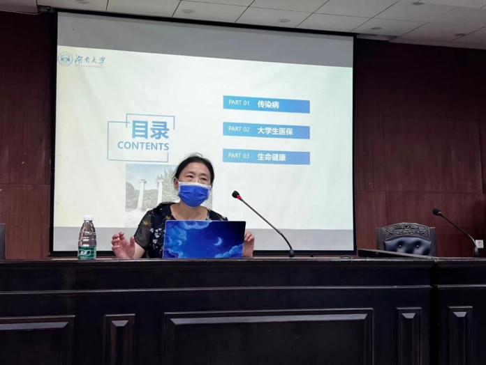 首先,尹老师结合自己的亲身经历,以生动通俗的语言向同学们强调了合理膳食的重要性,她告诫同学们:“健康是可以由自己做主的,要将健康意识植入大脑。”接着,尹老师从传染病、大学生医保、生命健康这三个方面展开讲解。