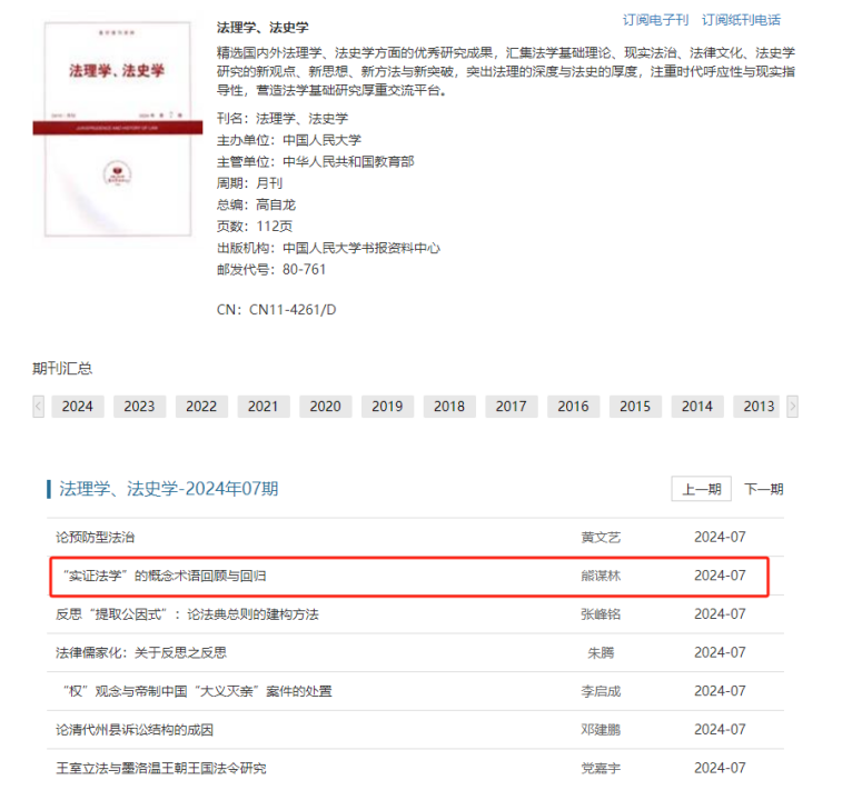 教授、刑事法学研究所所长熊谋林发表在《湖湘法学评论》2024年第1期“实证·数量法学”栏目的论文《“实证法学”的概念术语回顾与回归——基于文献的实证法学研究整合路径》被中国人民大学书报资料中心复印报刊资料《法理学、法史学》2024年07期全文转载。