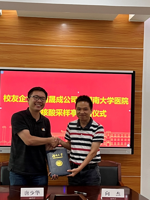 2001级工业设计专业校友、湖南晟成公司董事长唐少华先生发表了热情洋溢的致辞,表达了自己对母校深厚的感情,对白衣天使无比地敬佩,并讲述了自己的创业经历,介绍了企业的经营状况和本次捐赠的核酸采样亭的功能和特点。