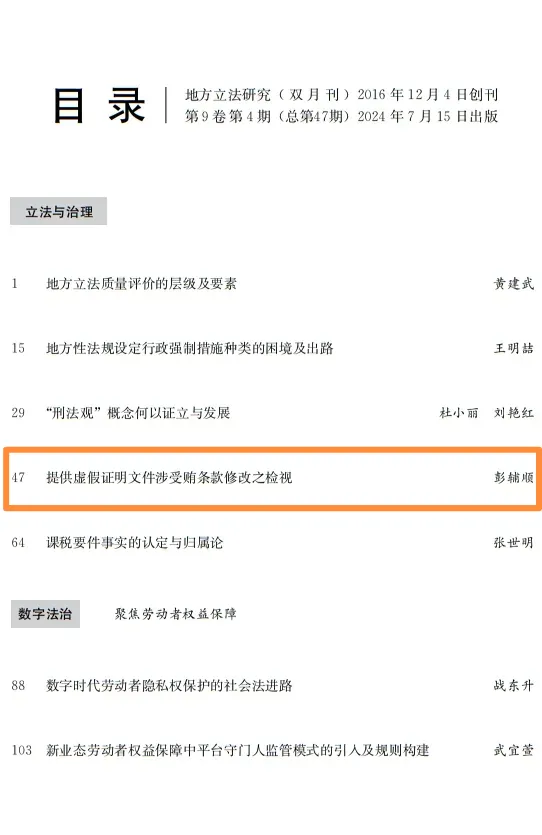 彭辅顺教授的论文《提供虚假证明文件涉受贿条款修改之检视》在《地方立法研究》2024年第4期刊发。