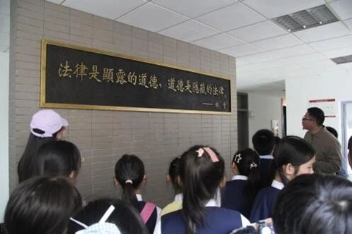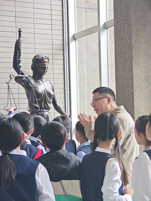 院楼。蒋老师为孩子们讲解了正义女神忒弥斯像,带领孩子们读诵院内镌刻的法律谚语,了解背后蕴含的公平与正义理念。随后来到院史馆,介绍 海角社区