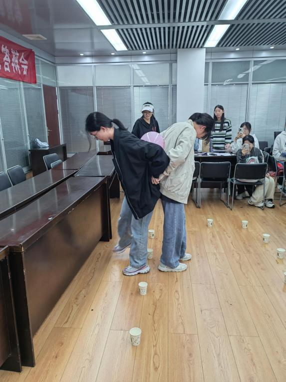 最后是"背对背拥抱"小游戏,一个团队派出四个人分为两组参加,两人背夹气球携手通过障碍物,将气球在尽量不使用手的情况下传递给下一组的两人,气球每掉落一次总时长增加一秒,用时最少的团队获胜。所有游戏的获胜团队都将获得零食奖励。同学们在享受游戏的同时,彼此间的默契也得到提升。
