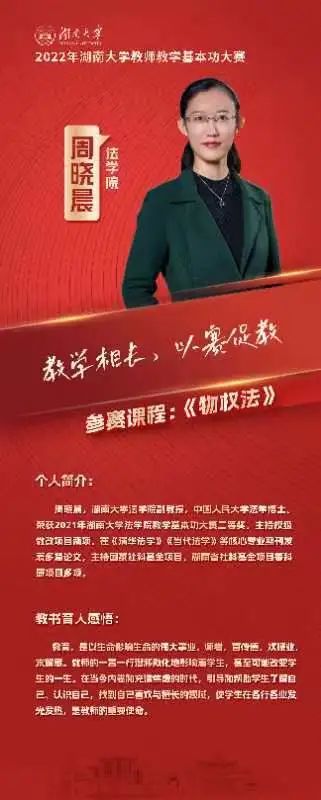 周晓晨老师通过学校督导随堂听课、教学设计等环节的层层选拔,从全校众多参赛选手中脱颖而出,获得参加文科组决赛的资格。决赛中,周晓晨老师以法学专业核心课程《物权法》参赛,选取建筑物区分所有权中的“住改商”问题进行讲解。周老师通过身边的生活事例引入主题,结合司法案例和法学基本原理,对《民法典》第279条进行了生动有趣的讲解。短短10分钟的现场授课,周老师亲切自如、深入浅出的讲课风格给现场评委和观众留下了深刻印象。最终,周晓晨老师荣获2022年 海角社区