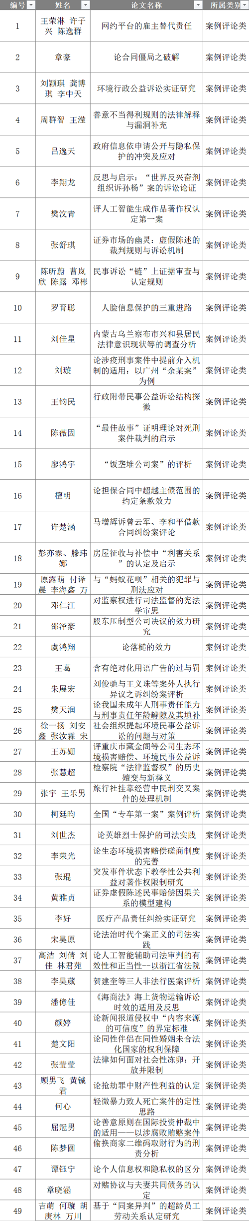 根据评审规则,每份作品由3位专家在回避的前提下进行匿名评审。受投稿数量的限制,法学论文类进入复赛需获得3个专家的“通过”票,案例分析类、人物书刊类需获得2个专家的“通过”票。最终通过专家评审的作品数量为:法学论文57份,案例分析52份,人物书刊45份。