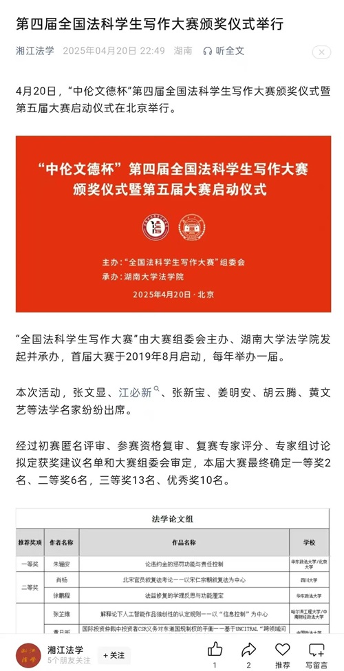 传法理文德,写锦绣华章。2025年4月20日上午,“中伦文德杯”第四届全国法科学生写作大赛颁奖仪式暨第五届大赛启动仪式在北京中国科技会堂举行。 “全国法科学生写作大赛”由大赛组委会主办、 海角社区